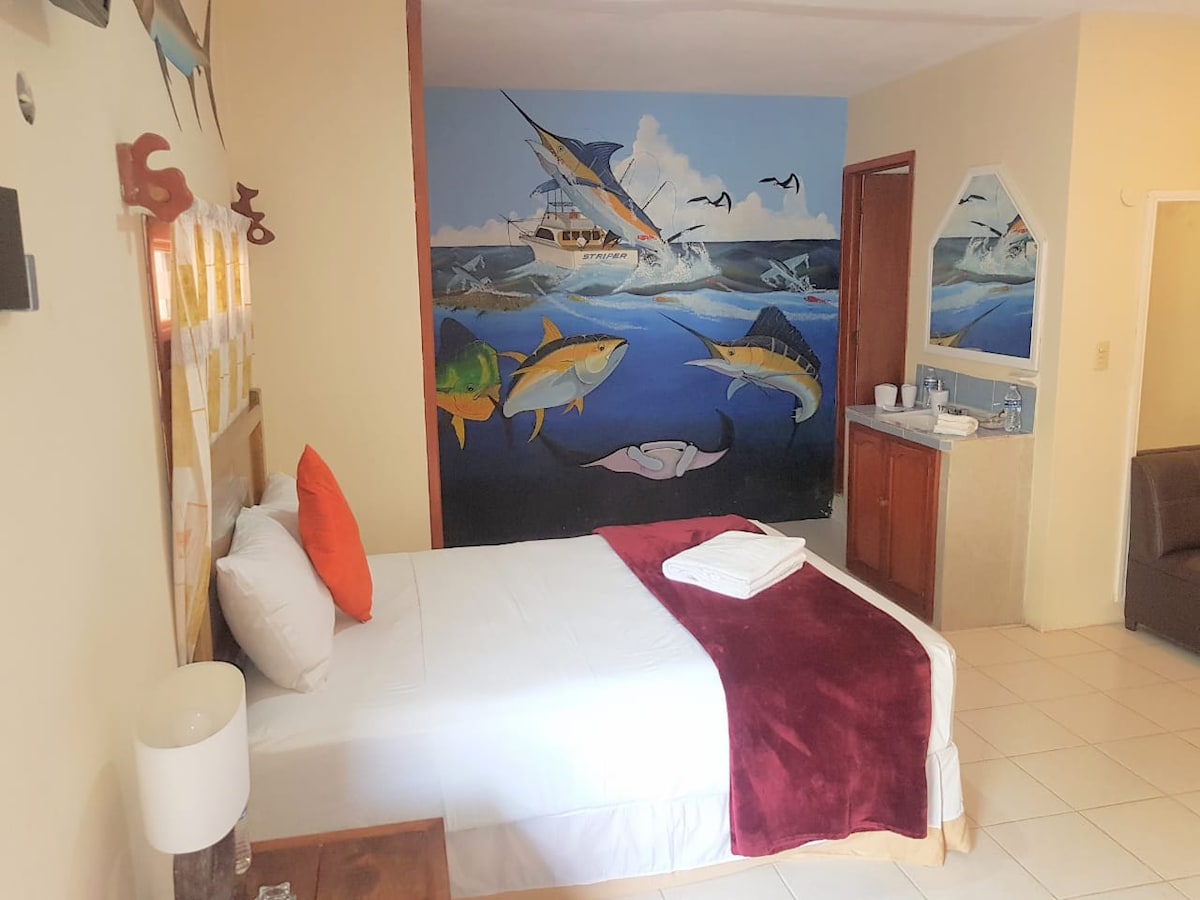 Скрытая комната Чукум на природе в деревне Пунта-Аллен. В этой отдельной комнате есть двуспальная кровать размера King size, собственная ванная комната, кондиционер и телевизор. Вы будете чувствовать себя комфортно в окружении прекрасных пляжей и лагун. Это рай для рыбаков! Жилье хорошо расположено всего в 150 метрах от пляжа и недалеко от центра деревни. Есть частный гараж. После полуночи кондиционер не работает из-за отключения электричества, однако мы предоставляем вентилятор с питанием от аккумулятора на всю ночь.