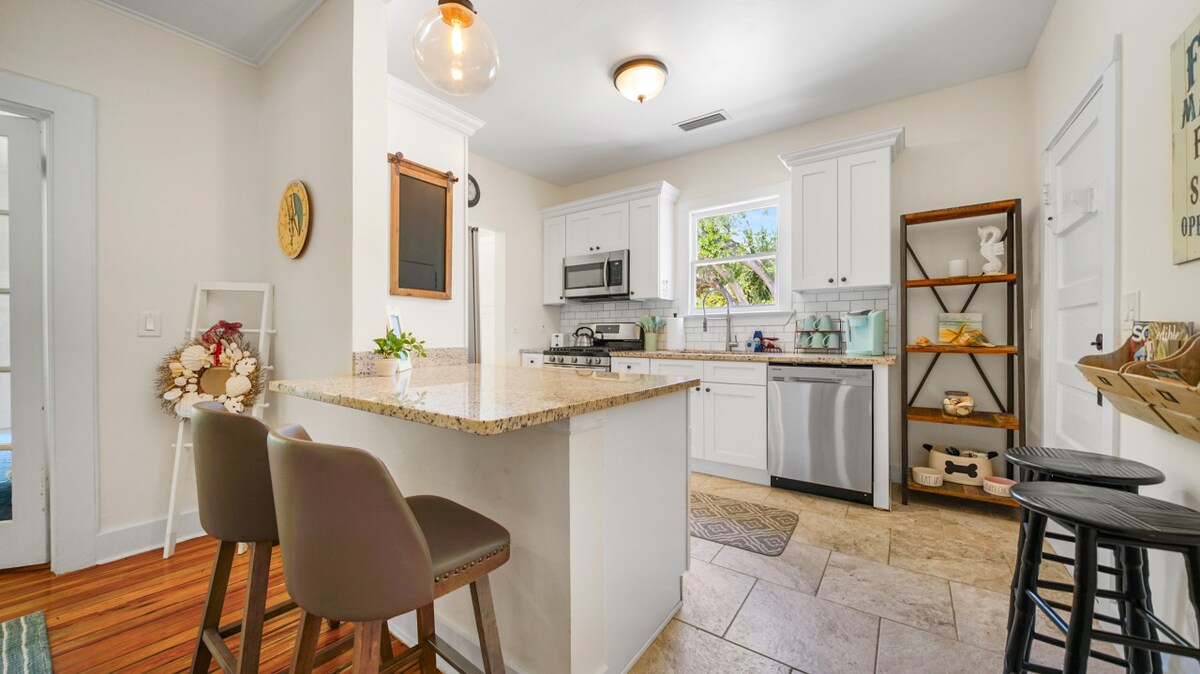 Отдых для любителей пляжа и океана — в нескольких шагах от тихого пляжа, недалеко от исторического района, в нескольких минутах ходьбы от продуктового магазина/ресторанов на набережной/коктейлей на крыше. Жемчужина с большим количеством открытых пространств. Светлая, просторная квартира в стиле коттеджа с мини-кухней (без духовки/плиты). Огороженная/закрытая большая территория. 1 минута ходьбы до тихого пляжа! Удобный пешеходный пляжный район. Короткая поездка на Uber в исторический район. Идеально подходит для пар (принимаем детей до 2 лет), одиночных путешественников и родителей студентов колледжа Флаглер.