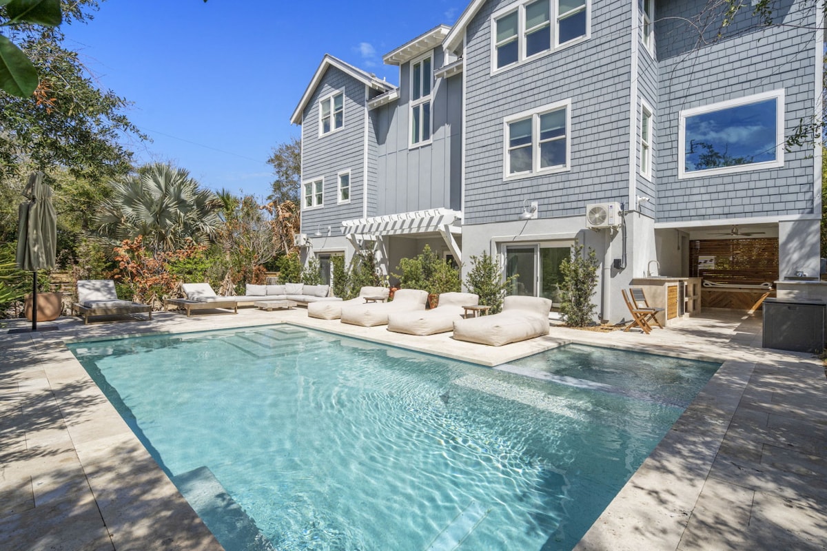 * Построено в 2023 году — роскошная мебель и постельное белье в прибрежном стиле. * Упоминание в журнале Good Housekeeping Mag 2024 года🌟 * 2 люкса с кроватью размера King size (1 на каждом этаже) | 2 спальни с кроватью размера Queen size | 3,5 ванные комнаты. * Частный бассейн с соленой водой и спа/гидромассажная ванна. * Кабинка у бассейна | Кухня на открытом воздухе | Крыльцо * Велосипеды, пляжные игрушки, пляжные стулья * Пышный тропический ландшафт. * 0,2 мили - великолепный тихий пляж. * 5,5 миль — исторический центр Сент-Огастина — старейшего города в США! * 0,2 мили - ресторан Cap's для ужина на закате на воде.