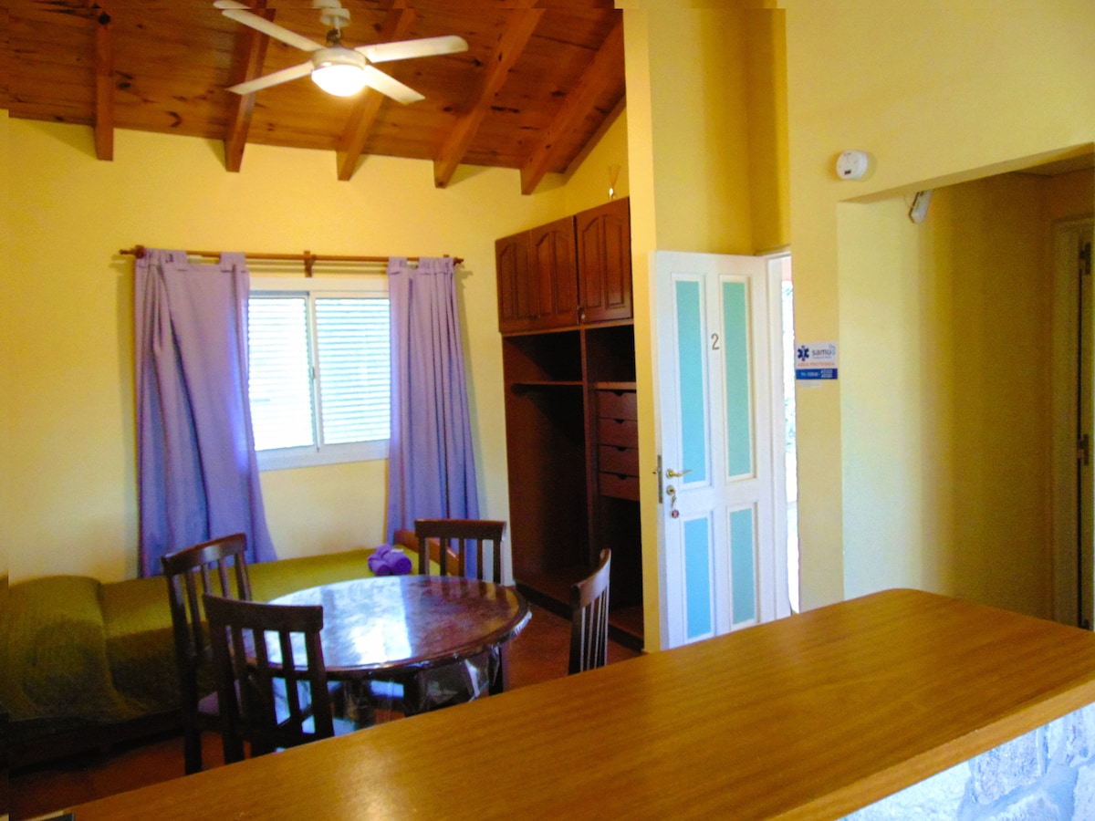 Casas en COMPLEJO TURISTICO, equipadas con vajilla y sabanas, 2 habitaciones, cama matrimonial e individuales, baño privado c/ agua fria y caliente, cocina a gas, calefón, heladera, Tv, Wifi. Contamos con: Pileta (compartida) Cocheras Cubiertas Parrilla/Asador Patio c/ tendedero Elementos de Cocina (Cubiertos, Platos, vasos, ollas) Elementos Limpieza Aire Acondicionado WiFi en dpto y zonas comunes TV por Cable Jardín y Parque de uso común con amplia sombra Juegos Jardín A 100m de la costanera
