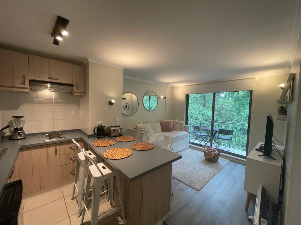 Прекрасное жилье, полностью оборудованное для 4 человек, в эксклюзивном кондоминиуме, окруженном местным лесом, недалеко от вулкана, в 5 минутах от озера и центра Пукона. К услугам гостей большие зеленые зоны, бассейн, закрытые и открытые квинчо, детская футбольная площадка, игры для детей. Отдохните всей семьей в этом тихом месте.