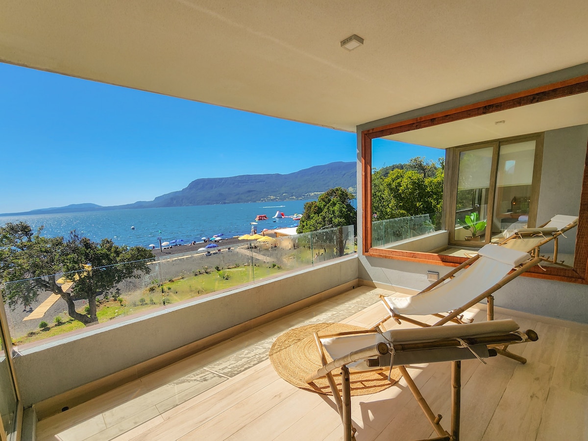 Эксклюзивная квартира в частном кондоминиуме на шесть человек, просторная и комфортабельная, с захватывающим панорамным видом на озеро Вильяррика. Квартира полностью оборудована, Wi-Fi, Netflix, спутниковое телевидение, большая терраса с грилем и обеденная зона на открытом воздухе. В здании есть бассейн, джакузи, кино, развлекательная комната, прачечная, тренажерный зал, частная парковка и доступ на пляж, с шезлонгами и зонтиками. Все к вашим услугам, чтобы сделать ваше пребывание мирным, расслабленным и незабываемым.