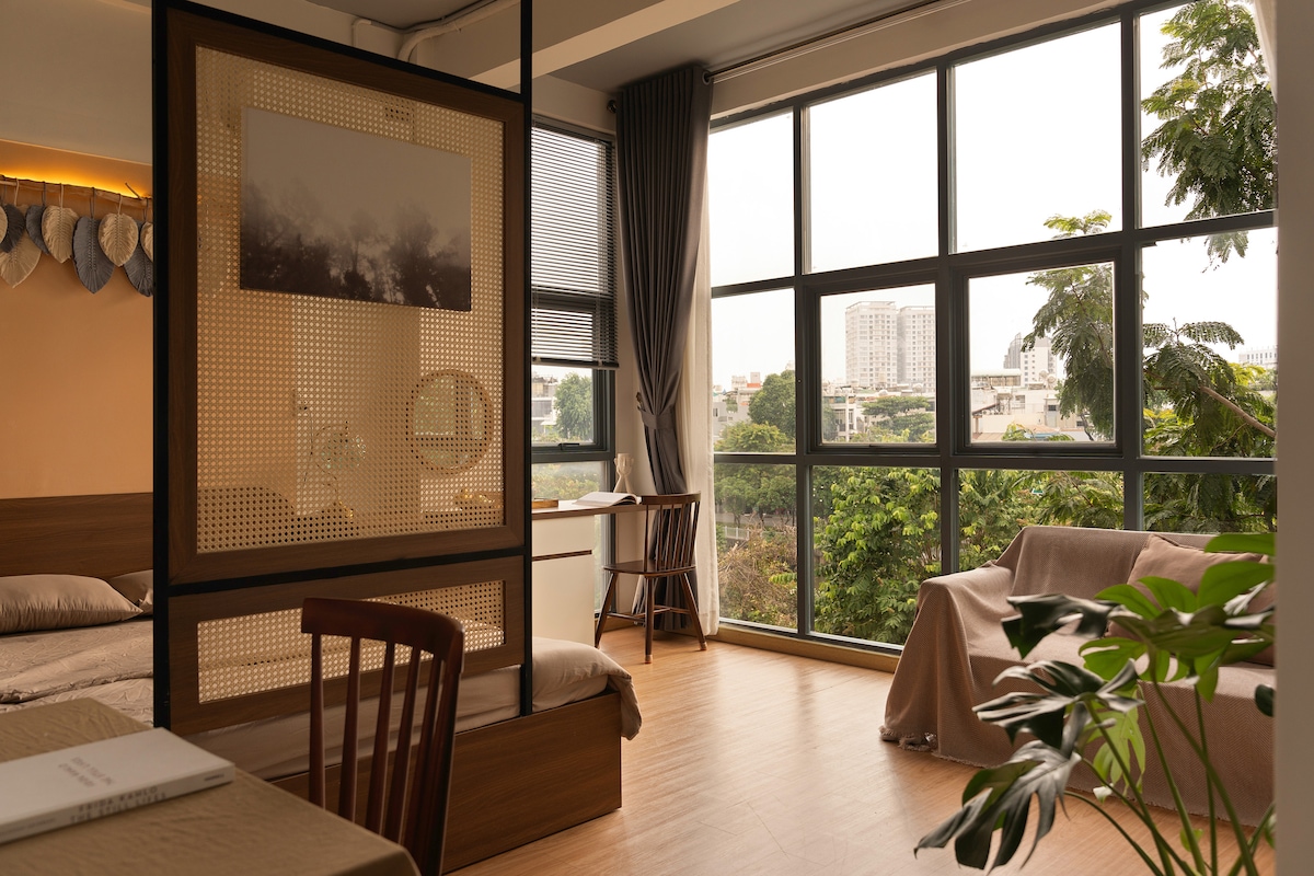 Welcome to Botanist Lab! We're a quirky, little homestay located in a less hectic part of central Saigon. Only 15 min from the airport & 15 min from Ben Thanh Market! Our minimalist studio has: - a queen bed, - full kitchen, - living room with work desk, sofa & coffee table, - bathroom with rain shower, - Smart TV with Netflix and bluetooth speaker - and private balcony The unit is one of 8 at the Botanist Lab. Guests will also have access to a shared kitchen, coworking area & washer/dryer.