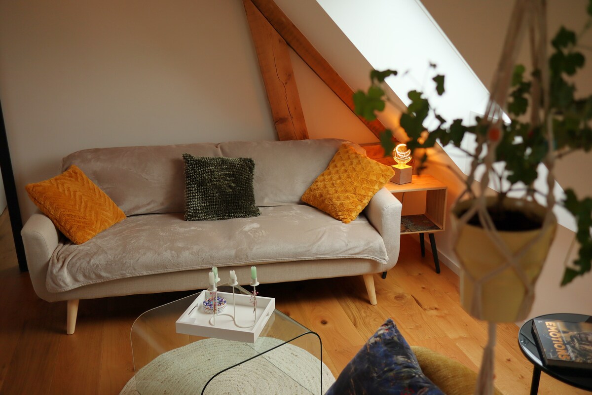 This charming attic apartment nestled in the heart of Virton, capital of Gaume offers a cozy and bright space and superb views of the surrounding area. Ideal for a relaxing getaway alone or as a couple. LGBT friendly. Discount available for stays of 8 nights or more (extra cost for 3rd and 4th additional travelers if cancelled) Authenticity and modern comfort. One bedroom with a double bed, a modern bathroom, a reading area and a mezzanine with 2 extra beds. 3rd floor, no elevator.