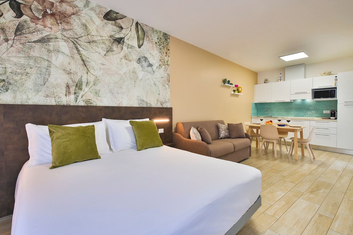 Большая современная двухкомнатная квартира идеально подходит для 4 гостей, оснащена двуспальной кроватью и двуспальным диваном-кроватью, обе с матрасами из пены с эффектом памяти. В распоряжении гостей все удобства: полностью оборудованная кухня с индукционной варочной панелью, большой холодильник, микроволновая печь и кофеварка Moka. Также имеется ванная комната с большим душем, телевизором Smart TV, феном, кондиционером/отоплением и бесплатным Wi-Fi.