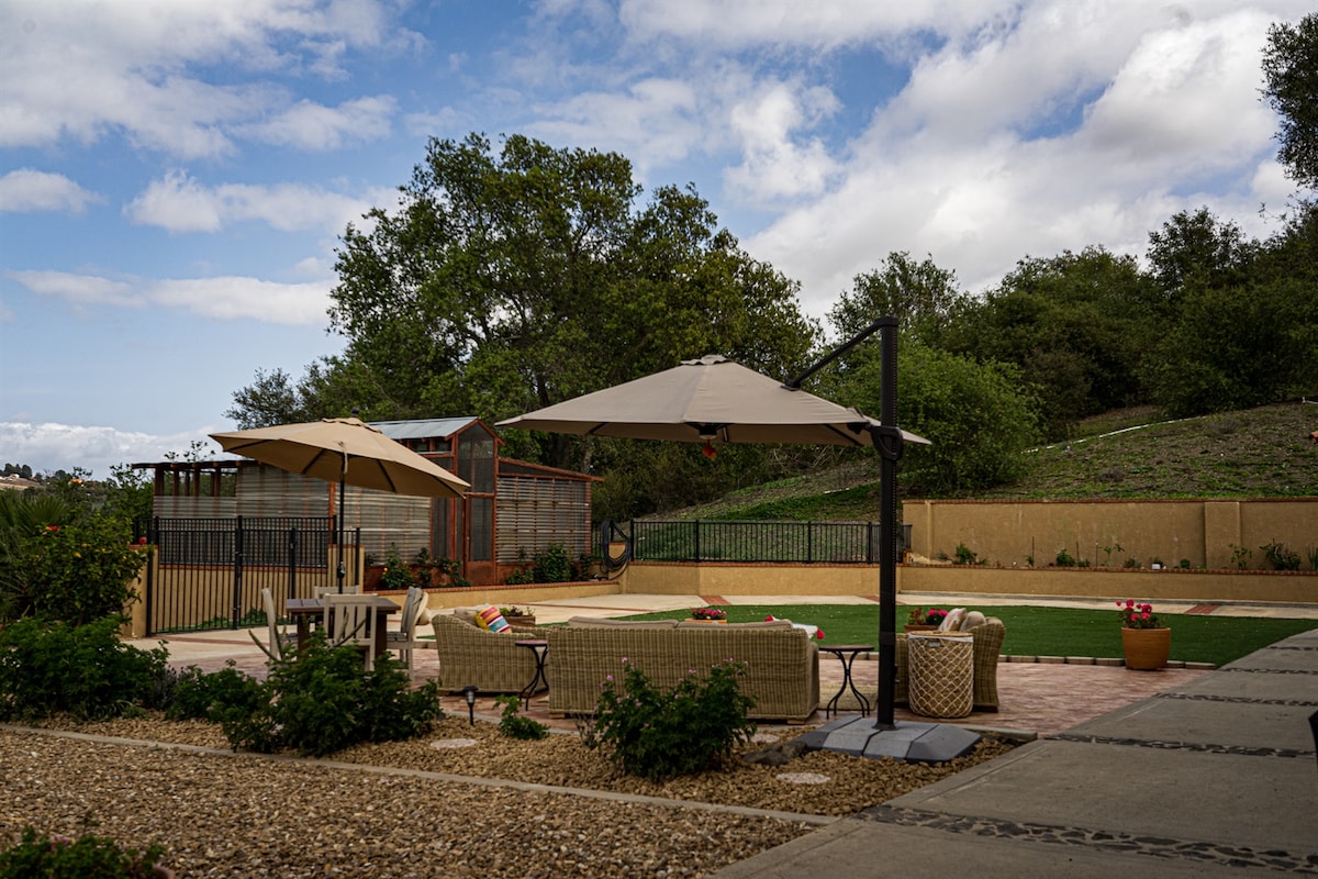 Северный Сан-Диего, экологичный, идеально подходит для семейного отдыха или интимных встреч, ужинов, небольших свадеб. 3 просторных спальни с ванными комнатами, выходящих на потрясающий частный бассейн и приусадебный пейзаж, окружающий виллу. Расслабьтесь у бассейна с солнечным подогревом и пропановым подогревом в наземном спа-салоне. Создайте вдохновленную еду на большой открытой кухне с бытовой техникой Viking.