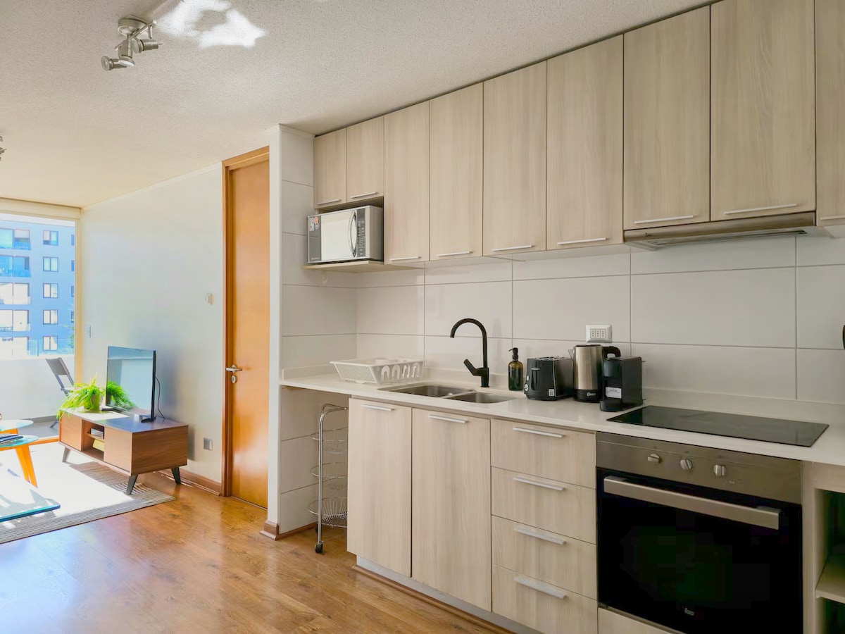 Добро пожаловать в ваше убежище в Витакуре Приглашаем вас насладиться этой комфортабельной и светлой квартирой, расположенной в одном из самых красивых и безопасных районов Сантьяго. Вы будете в пешей доступности от парка Арауко, Open Kennedy, парка Араукано и немецкой клиники. Квартира спроектирована так, чтобы вы почувствовали себя как дома: в ней есть встроенная кухня из дерева, полностью оборудованная, чтобы вы могли готовить все, что захотите; очень удобная кровать размера King size и диван-кровать с наматрасником.
