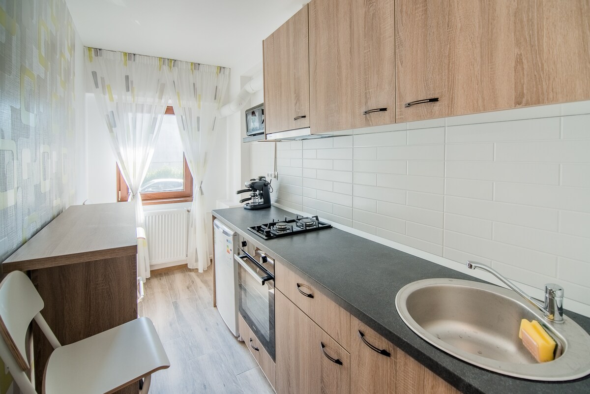 Откройте для себя ультрасовременное и универсальное пространство всего в 350 м (5 минут) от площади Унирии. Центральным элементом является стеклянная стена, отделяющая спальню от гостиной, оснащенная непрозрачными шторами для полной уединенности. Эта квартира идеально подходит для 4 человек и предлагает идеальное сочетание стиля и функциональности. — Затемняющие шторы для контроля освещения. — Подземная парковка включена (безопасный доступ). — Раскладной диван в гостиной. — Современная ванная комната с душем и телевизором со Smart TV. — Самостоятельное прибытие и сверхбыстрый Wi-Fi.