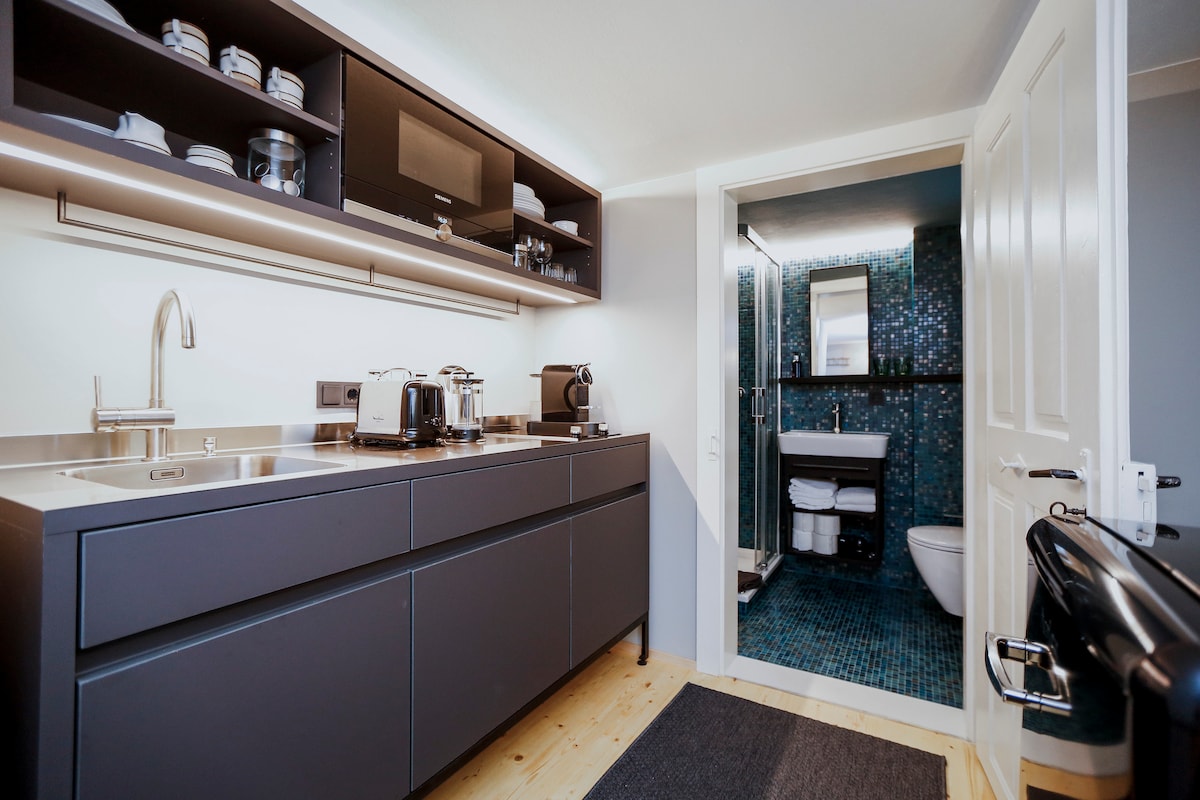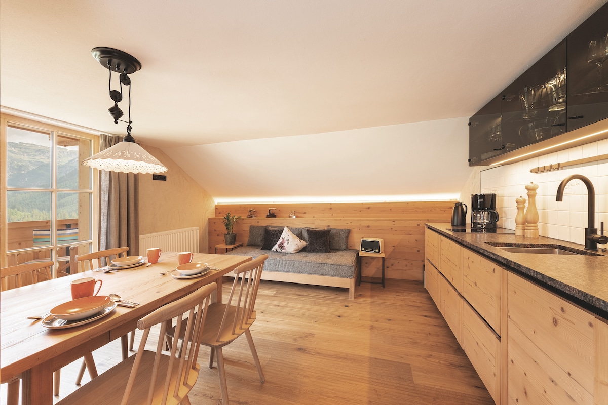 С любовью обставленная квартира площадью около 30 м² с новой очень хорошо оборудованной кухней-гостиной, плитой с духовым шкафом, посудомоечной машиной, холодильником с морозильной камерой, микроволновой печью, кофемашиной, тостером, чайником, диваном (спальным местом для 3-го человека), телевизором с плоским экраном, уютным уголком для отдыха, 1 новым душем/туалетом, большой меблированной террасой и панорамным видом на наши великолепные горы, шкафом, постельным бельем и полотенцами в достаточном количестве, бесплатным доступом в Интернет.