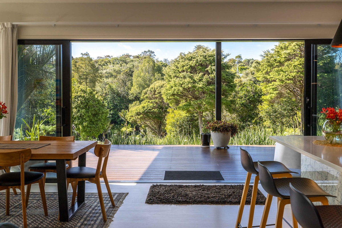 Расслабьтесь с друзьями и семьей в этом архитектурно оформленном и современном доме с 2 спальнями и 2 ванными комнатами, вдали от проторенных дорог. Наслаждайтесь непрерывным видом на море с террас и гостиных открытой планировки. В окружении местного кустарника и субтропического сада вы сможете насладиться потрясающей панорамой на уровне верхушек деревьев под пение местных птиц. Идеальное место, чтобы насладиться природой или полюбоваться закатом и ночным небом. Рядом с отмеченными наградами виноградниками/ресторанами и канатной дорогой Man O'War Forest Zipline.