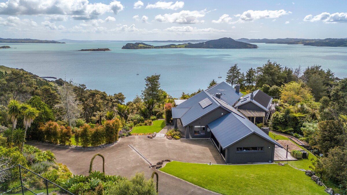 Beautiful New Home , breathtaking views over Pie Melon Bay and beyond, hear the waves lapping along with the native bird life and bush right alongside your outdoor seating, no photo's can truly capture the beauty of the sparkling view 3 Minute drive to the stunning Onetangi Beach & Ocecanside Restaurants or 15 Minute Walk High Quality amenities and Restaurants , 2 level home with decks on each level and also off the Master bedroom With Spa pool and large Sun Deck on lower level