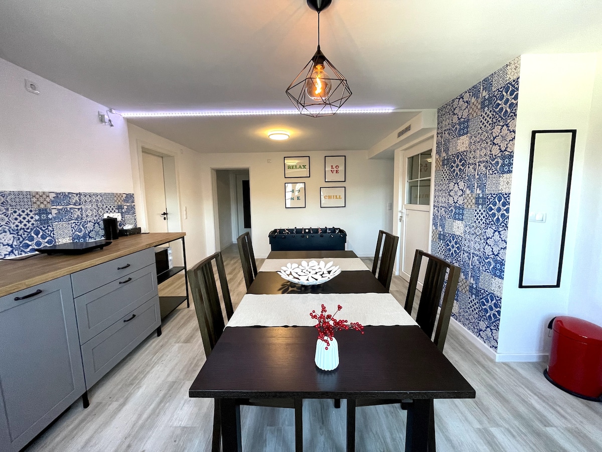 Добро пожаловать в нашу недавно отремонтированную, стильно обставленную квартиру с садом – идеальное место для отдыха или деловой поездки в прекрасном Вальдкирхе! Квартира тихая, но расположена в центре города и рассчитана на 6 человек (около 80 м²). Благодаря двум большим террасам и частному саду вы можете наслаждаться солнцем по утрам и отдыхать с барбекю по вечерам. Атмосфера теплая, уютная и современная – место, где можно чувствовать себя хорошо и отключиться.