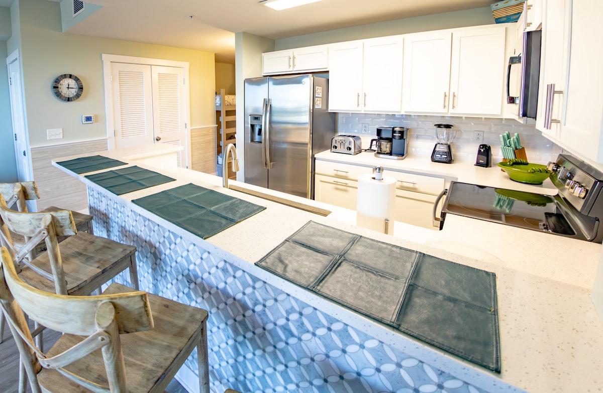 Кондоминиум Tidewater на 16-м этаже с видом на залив и прекрасным видом на океан с балкона. Этот вариант планировки с 2 спальнями + комнатой с двухъярусными кроватями рассчитан на 8 человек и идеально подходит для семей и групп. К услугам гостей 3 полностью оборудованные ванные комнаты, спальня с кроватью King size, спальня с кроватью Queen size, двухъярусная кровать, раскладной диван, быстрый Wi-Fi, 70-дюймовый смарт-телевизор, стиральная/сушильная машина и полностью укомплектованная кухня. Легкий доступ к пляжу, прогулка до парка Пьер-Парк и удобства курорта, включая бассейны, джакузи, рестораны и Starbucks. Предоставлены четкие инструкции по заселению, включая советы, как избежать загруженности лифта.