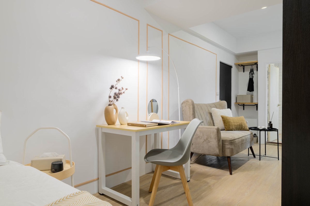 室內的灰白主色,配搭北美木紋銅色傢俱及家飾, 用心為您的居住空間提供沈靜優雅的感覺。日韓系電器的選用,不論是無線充電藍牙喇叭 ,大螢幕伸縮高清電視 ,都能滿足您對影音效果的要求。房源位於高樓內縮樓層,阻絕不必要的噪音並滿足您對景觀 ,安靜及隱私的要求。大樓並配有全天候警衛,住戶專屬電梯 ,公用大露台 ,以及地下收費停車場, 位處西門町核心路段,無論搭乘捷運或自駕都非常方便。Дизайн интерьера на основе земли предлагает теплый, спокойный, исцеляющий и восхитительный атмосферу. Удобства в номере, включая двуспальную кровать, ванную комнату с душевой кабиной, кондиционером, телевизором Smart 4K с фильмами/Netflix, WI-FI, освещением в бухте и музыкальным проигрывателем с беспроводным подключением и USB-зарядными устройствами.