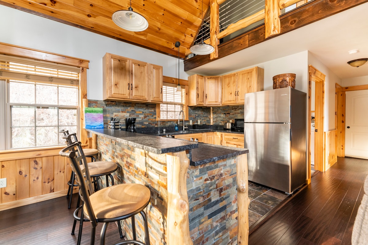 Уникальное индивидуальное жилье, специально построенное для квестов Airbnb. Этот дом отличается особенным дизайном с большой спальней на чердаке и полностью отделанной плиткой ванной комнатой. Из лофта открывается вид на гостиную внизу с открытой гостиной, обеденной зоной и кухней. Вторая спальня и ванна расположены на первом этаже. Гранит, шифер и мыльный камень подчеркивают столешницы, раковины и полы. Вы также увидите много натуральной сосны, икоры и местного кедра по всему дому.