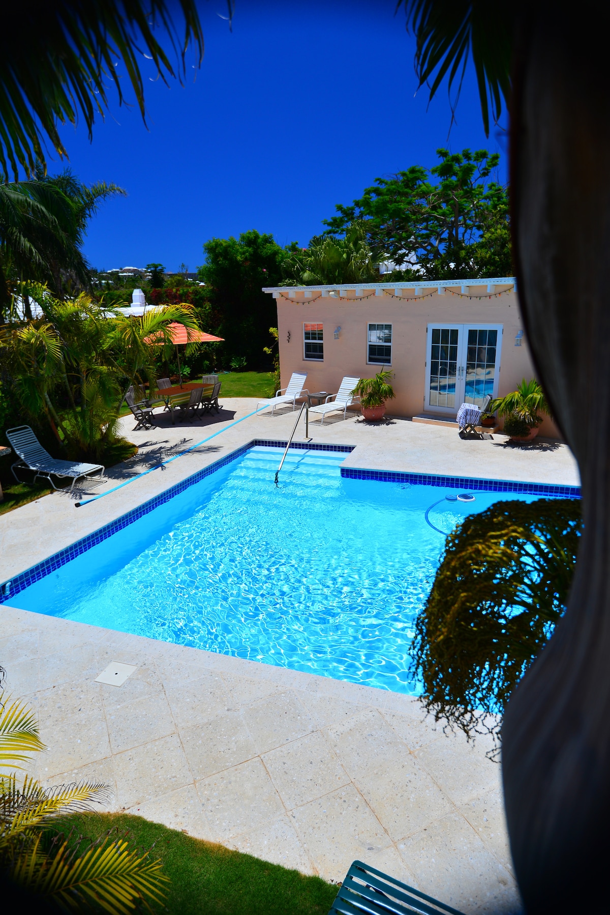 Ваш собственный бассейн + башня на пышном участке площадью 5 акров Коттедж Sea Glass — 6-е место в рейтинге лучших Airbnb на Бермудских островах по версии Condé Nast и 1-е место, которое не находится прямо у воды Просторный домик у бассейна площадью 1400 кв. футов: гостиная открытой планировки + столовая с открытыми балками, высокими потолками, отдельной спальней, кондиционером + удобной кроватью размера Queen size. Хорошо оборудованная кухня с полноразмерным холодильником, барбекю Обновленная ванная комната, душевая кабина. Телевизор, стиральная машина/сушилка, потолочные вентиляторы, выделенный Wi-Fi. Великолепный бассейн только для вас.