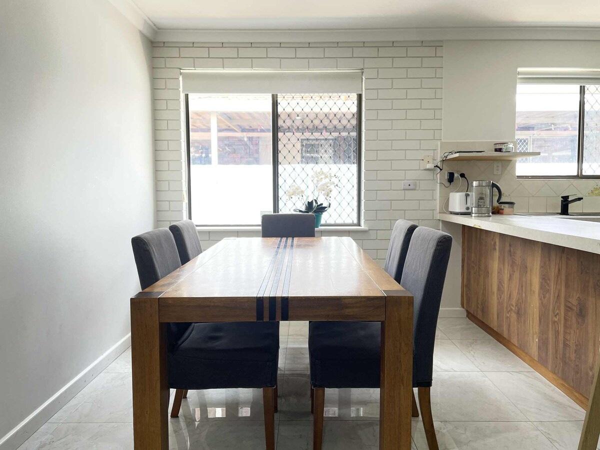 Добро пожаловать в наше уютное жилье! Остановитесь в уютной комнате с кондиционером, кроватью размера Queen size, большим окном и шкафом. Для вашего комфорта рядом есть отдельный душ и туалет. Общие помещения включают гостиную и обеденную зону, кухню и открытую площадку. Удобное расположение: вождение 🚗 • 15 минут езды до аэропорта Перта. • 5 минут езды до торгового центра Westfield Carousel Mall. • 22 минуты езды до города Перт. • 32 минуты пешком / 5 минут езды до станции Каннингтон, → 20 минут на прямом поезде до города Перт.