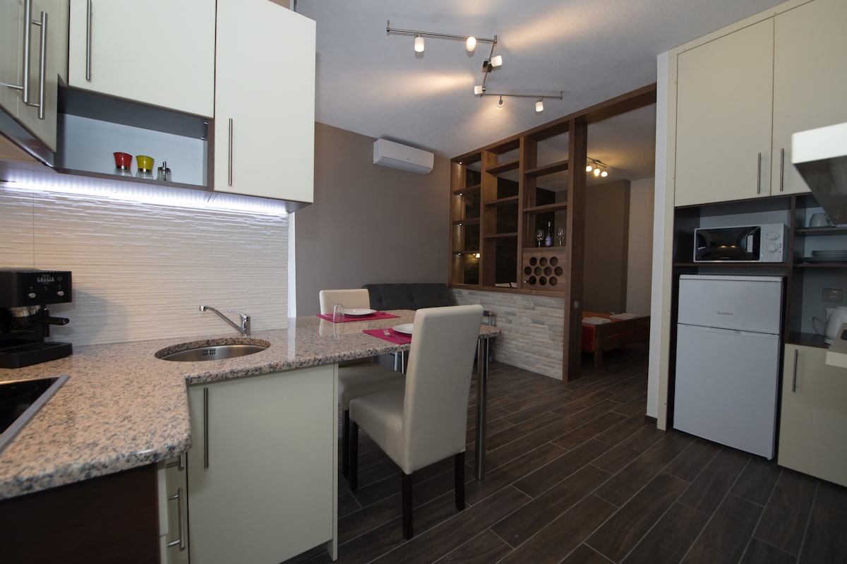 Квартира № 1: Размер: 65 кв. м, 4+1 гостя Две спальни (1 двуспальная кровать, 2 односпальные кровати), гостиная, кухня и обеденная зона, ванная комната (туалет, биде, душ, фен), просторная терраса