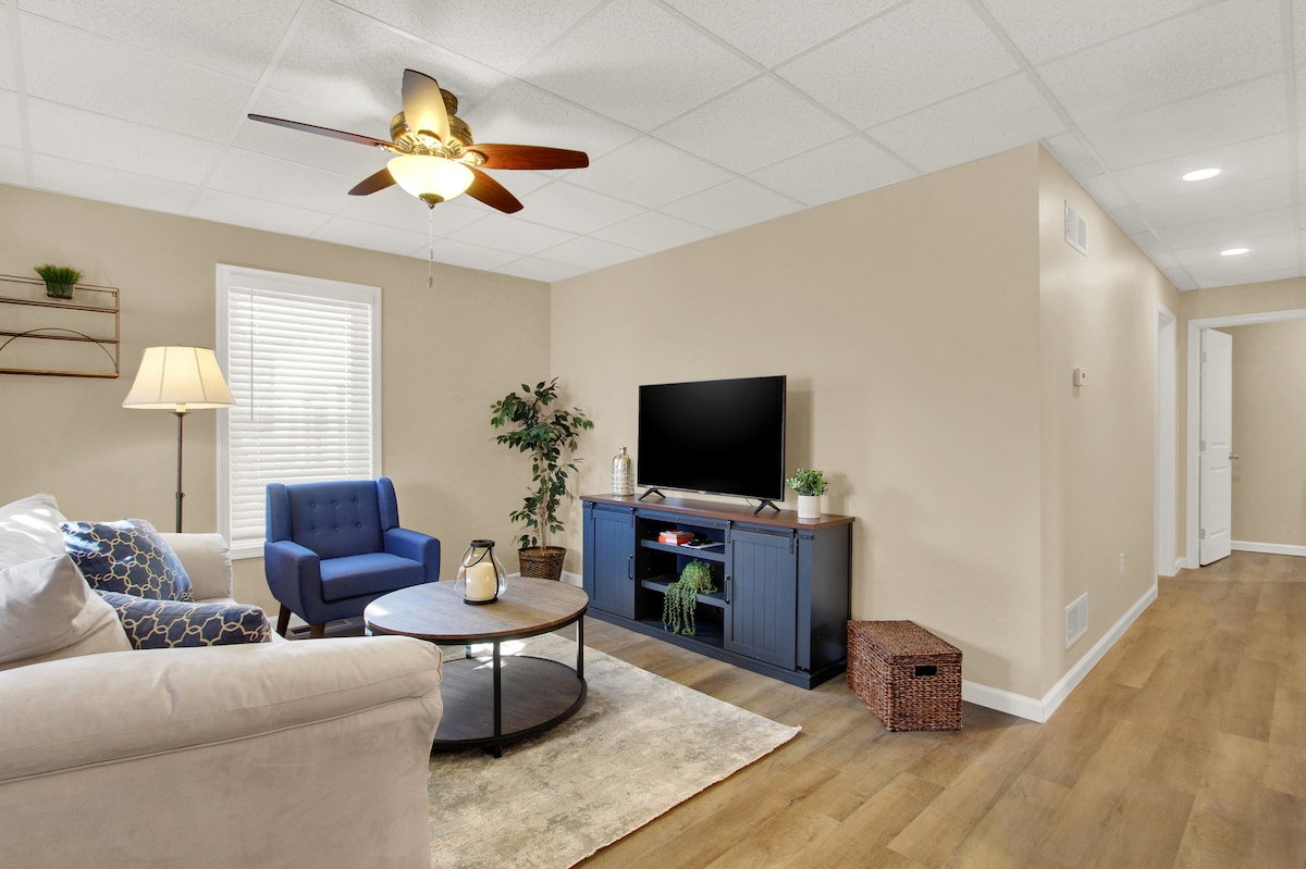 Посмотрите на красивый город Нью-Оксфорд! Эта квартира находится всего в двух кварталах от городского круга и лучшей кофе и пекарни в Пенсильвании! В этой частной квартире с 1 спальней могут разместиться до 4 гостей, в которой есть 1 кровать размера King size, а в гостиной - еще одна двуспальная кровать размера King size или две односпальные кровати. В квартире также есть 1 ванная комната с душем/ванной, стиральной и сушильной машинами, полностью оборудованной кухней и гостиной с 55-дюймовым телевизором, Wi-Fi и многим другим.