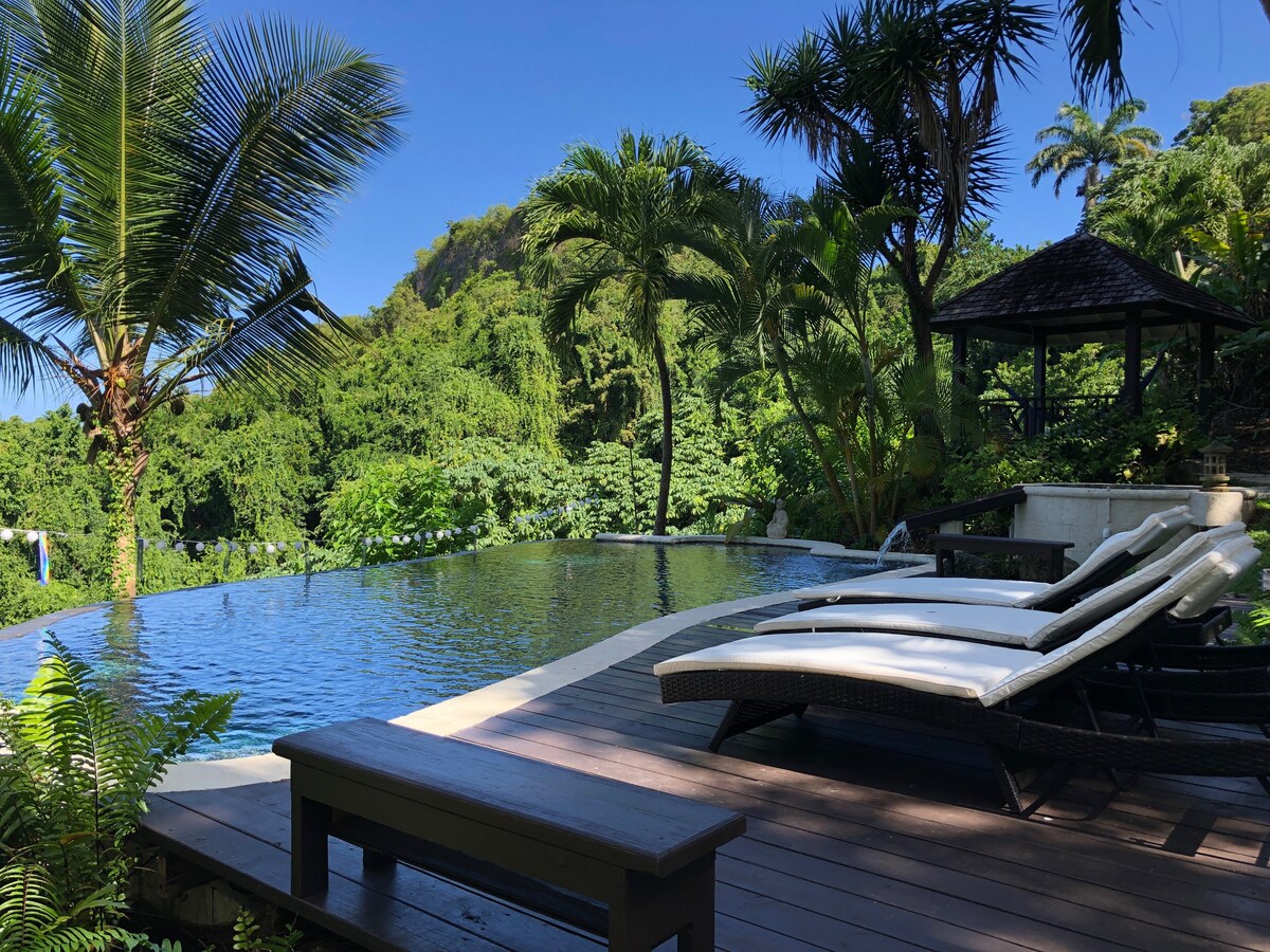 В этом 1-комнатном номере есть большая крытая открытая частная обеденная зона с видом на море. Расположение на спокойной плантации площадью 10 акров, в окружении полей сахарного тростника. В окрестностях есть тропы для прогулок по джунглям и много интересного. Посетите историческую хижину рабов. Всего в 7 минутах езды от пляжа. Расслабьтесь в этом уникальном и спокойном месте.