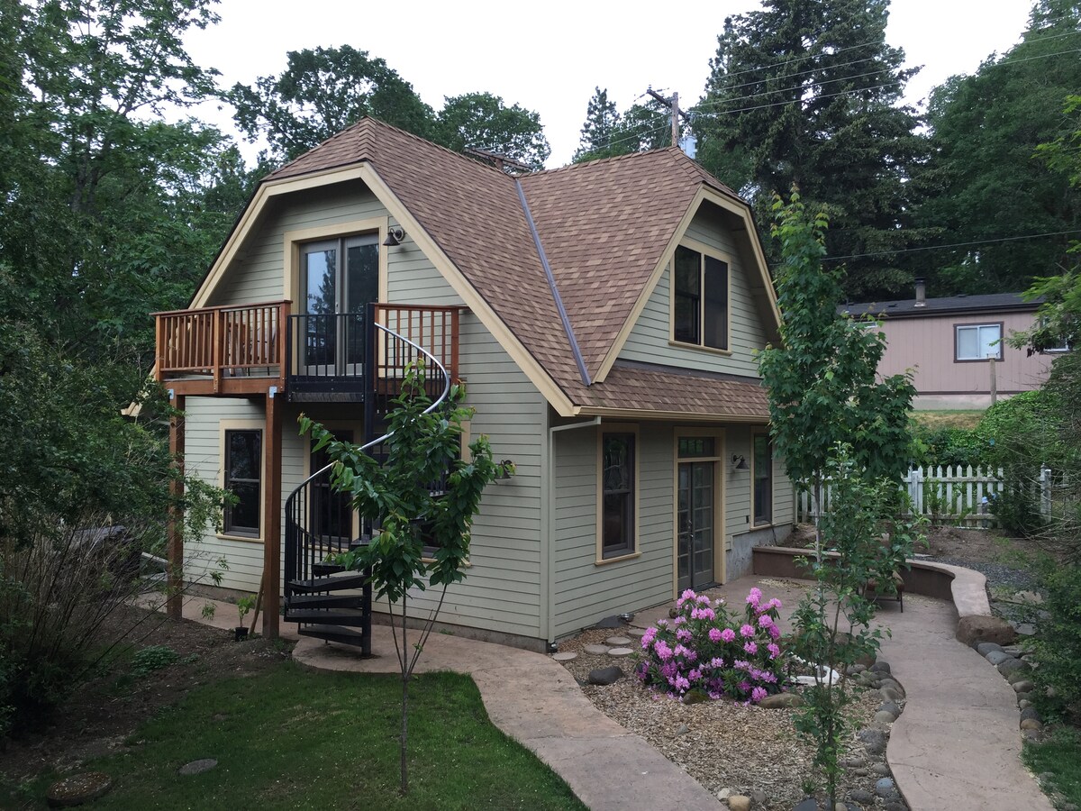 Поднимитесь по винтовой лестнице в студию Treetop! Насладитесь вашим утренним кофе на террасе, когда солнце встает над горой Бурдоин. Эта студия на заднем дворе, полная света, просторной, но уютной. К услугам гостей полноразмерная кровать, небольшая мини-кухня, ванная комната с туалетом, телевизор (без кабельного телевидения - с Интернетом или DVD), кожаным диваном и кондиционером. Пройдите 1-3 квартала до общественного парка, теннисных кортов и центра Уайт-Салмона с его пекарнями, фантастическим книжным магазином, пивоварней и отличными ресторанами. Идеально подходит для одного или двух гостей.