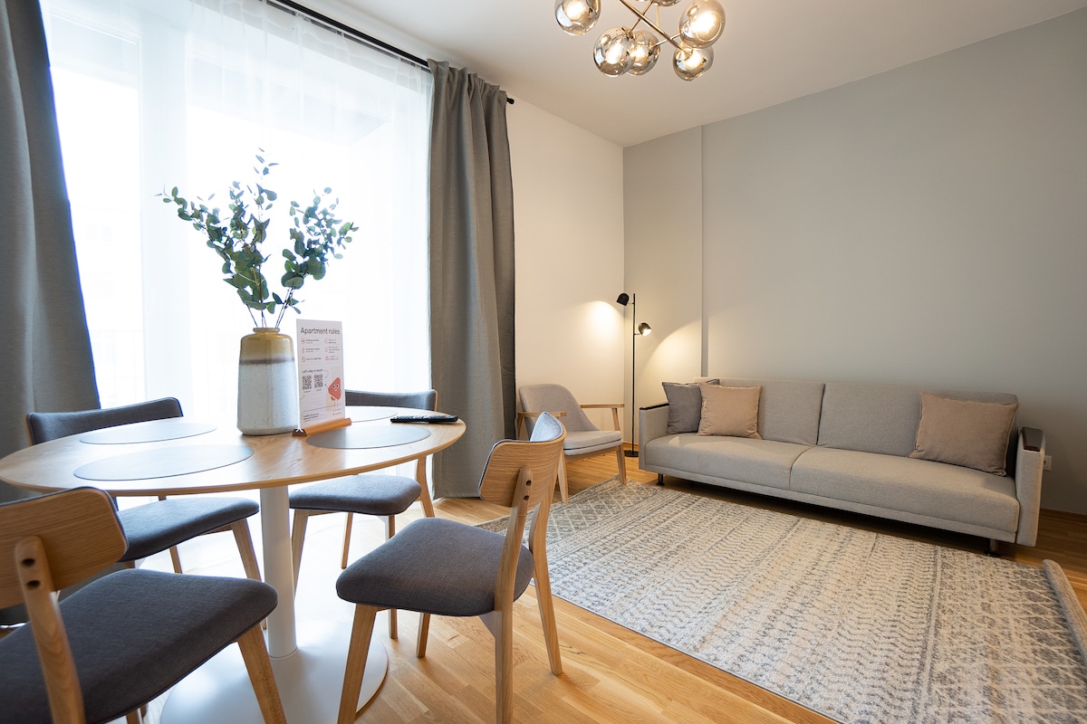 Моя идеально расположенная (всего в 10 минутах ходьбы от 1-го района) современная квартира площадью 72 кв. м (= 720 кв. футов) очень солнечная, с огромными дверями террасы и красиво меблирована. До всего легко добраться на общественном транспорте; U1 (метро) находится всего в 2 минутах езды. Вся квартира в вашем полном распоряжении, включая посудомоечную машину, стиральную машину, Wi-Fi и кухонную утварь. Прихожая, открытая кухня (КОФЕМАШИНА NESPRESSO), столовая/гостиная, спальня, ванная, отдельный туалет + бесплатная парковка.