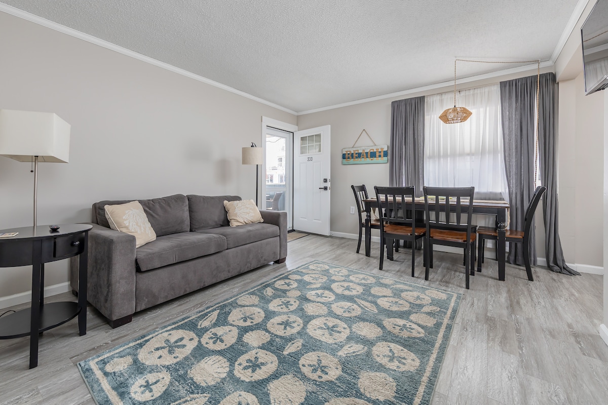 Жилье в 1% лучших по рейтингу, идеально подходит для одиноких путешественников, пар или небольших семей. Отличное расположение: в нескольких шагах от набережной, пляжа, развлечений и аквапарков! — Рейтинг суперхозяина 4,98. - Шаги до пляжа. — Зарядное устройство для электромобилей через дорогу. — Высокоскоростной Wi-Fi 10 Гбит/с. - Современная мини-кухня. — Удобные кровати и USB. - Сиденья на улице. - Самостоятельное прибытие. Уютная студия на 4, (2) кровати, чистая ванная комната, мини-кухня. Расслабьтесь с 50-дюймовым смарт-телевизором. Гости в восторге от соотношения цены и качества, расположения и удобств. Лучшие даты быстро распродаются! Нажмите «Проверить свободные даты».