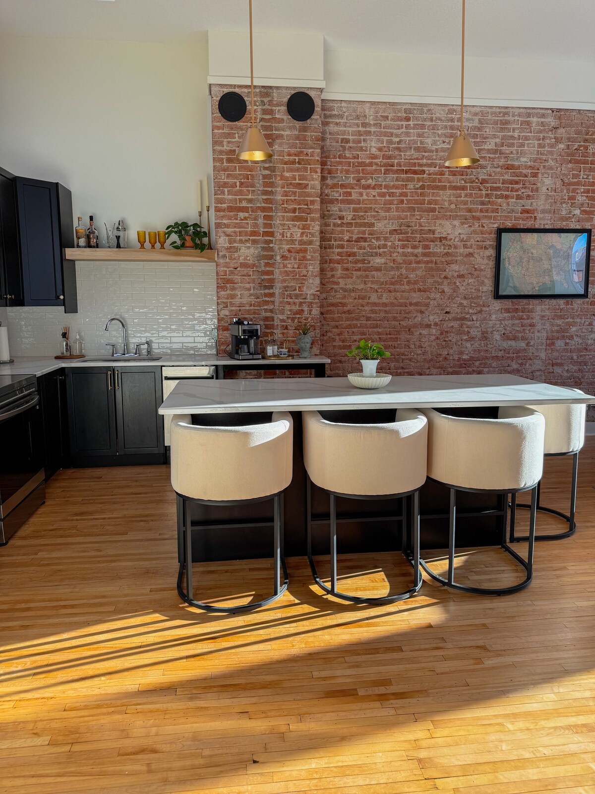 A two-bedroom apartment above Getaway Motor Cafe in historic downtown Carver, MN. Built in 1871, carefully restored, and designed with a Nordic Modern warmth that makes you want to stay a little longer. Jøtul fireplace, gourmet kitchen, private balcony over the creek, and a cafe downstairs for morning coffee and evening cocktails. Sleeps 4. Small-town charm, miles of trails. Come rest.