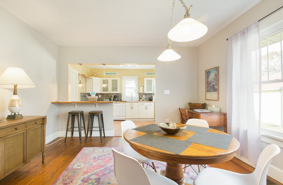 Наше бунгало 1920-х годов с отличным естественным освещением и комфортным пространством определяет хюгге — уютное удовлетворение и простое наслаждение. Бунгало включает: — Комфортабельные гостиная и столовая. — Большой огороженный задний двор для отдыха с вашим питомцем. — Полностью оборудованная кухня для приготовления пищи (по желанию). — Легко добраться до частной парковки. — винтажная стереосистема с Bluetooth; — Потолочные вентиляторы в спальнях и гостиной. - Бесплатный чай и кофе. — Удобный доступ ко всему, что может предложить Эшвилл!