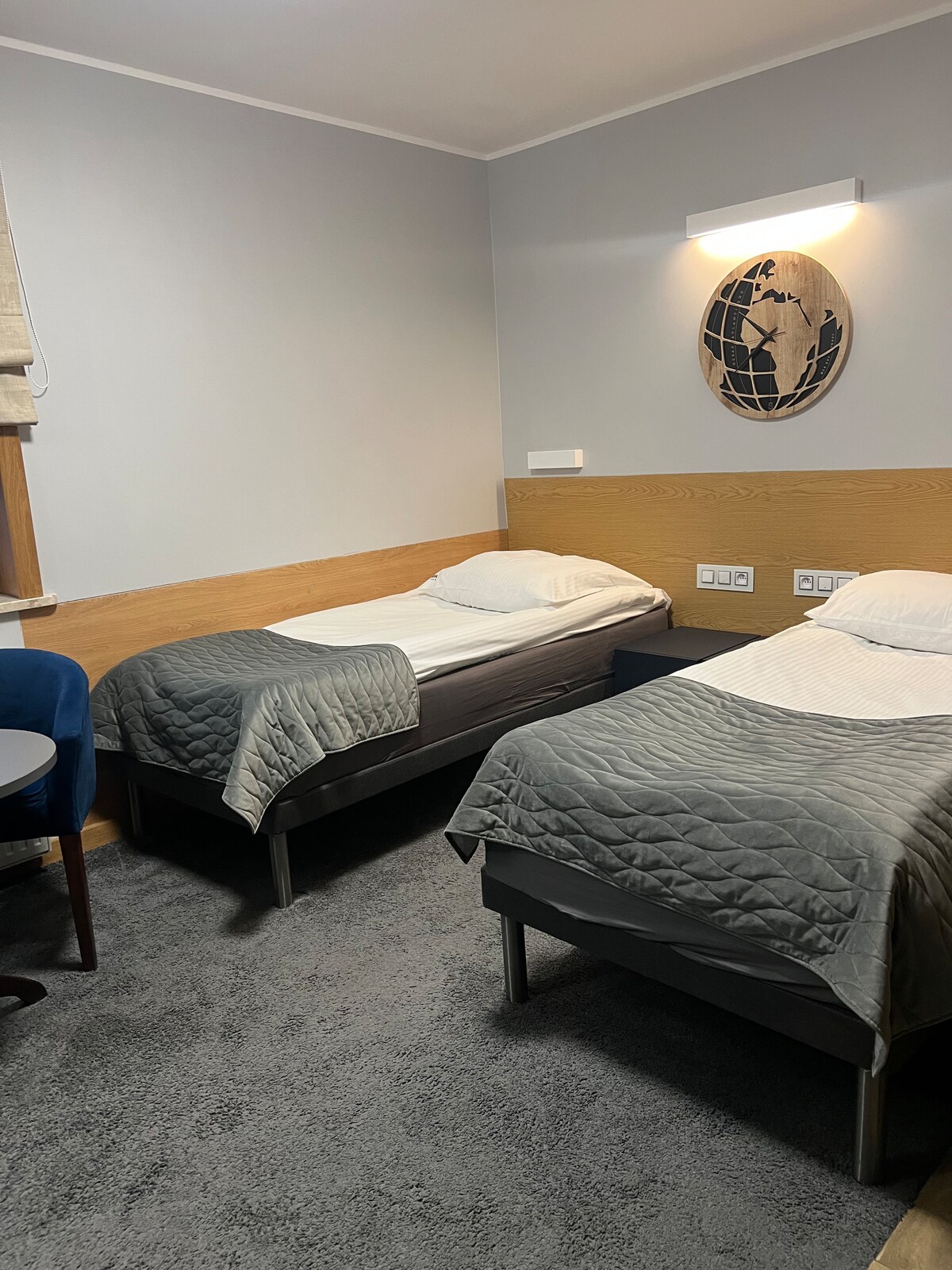 Hotel Kosmowski. Pokój z dwoma łóżkami pojedynczymi i prywatną łazienką. W obiekcie znajduje się również siłownia do użytku gości, sauna (dodatkowo płatne) oraz restauracja. w cenę wliczone jest śniadanie w formie bufetu szwedzkiego