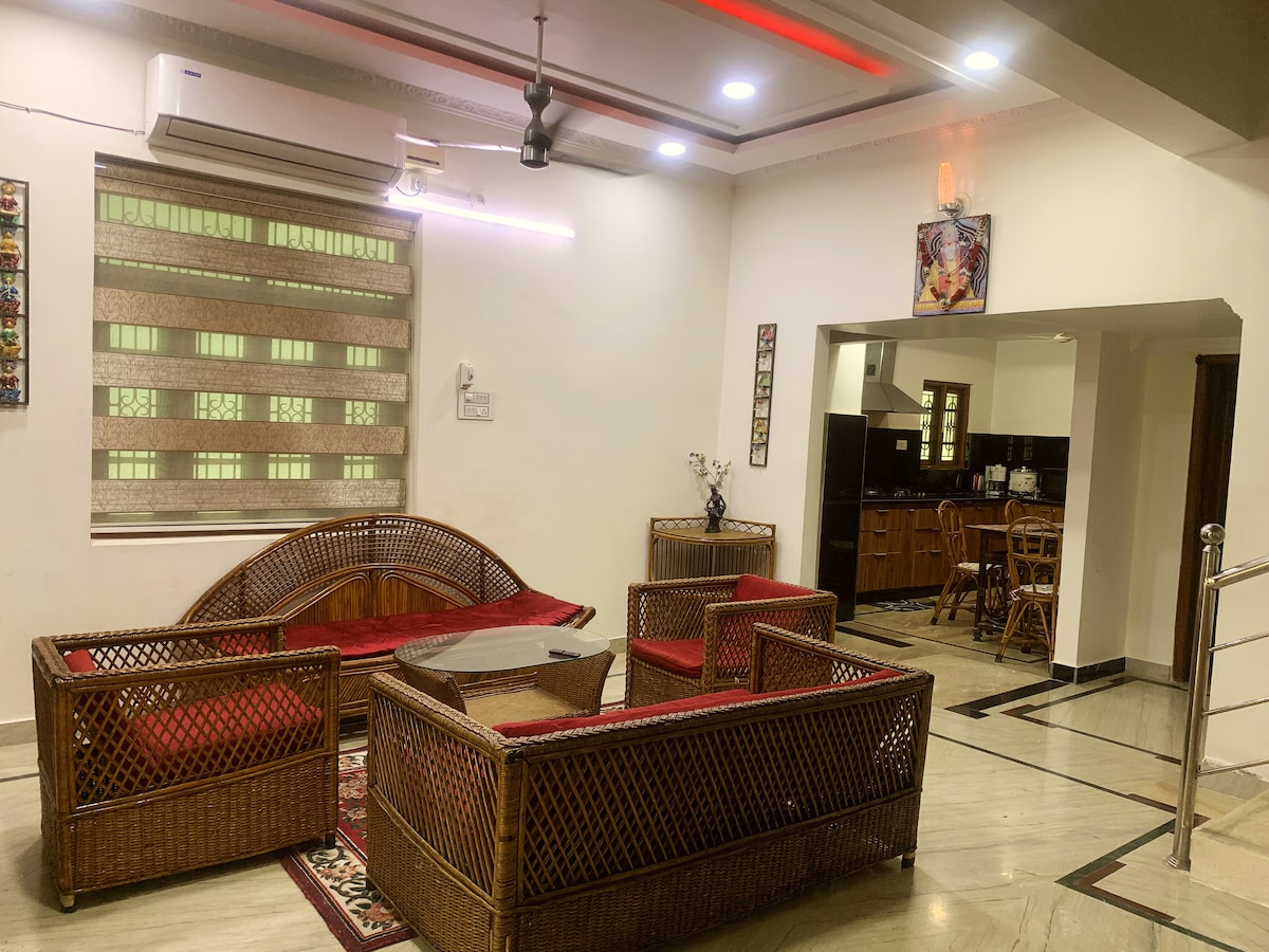 Отдохните и расслабьтесь в этом спокойном и стильном месте. В нашем жилье есть 2 спальни (обе с кондиционером), 2 залы и 2 ванные комнаты. Отлично подходит для туристов, семейных встреч, корпоративных встреч, пар и друзей. Вы будете бронировать двухуровневую виллу на первом этаже с балконом на первом этаже. Вы можете приготовить еду на кухне с уже предоставленной посудой или заказывать онлайн. Интернет-телевизор с Netflix, Prime, Aha и Hotstar активен.