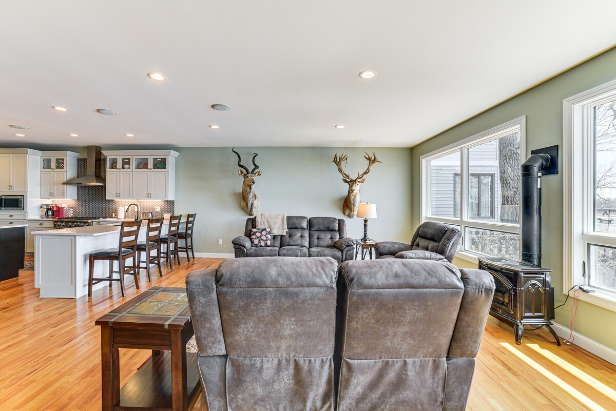The Hideout on Ridgeway, a peaceful escape tucked away in nature yet close to everything you came for. 5 minutes to Gavin’s Boat Ramp on Lewis & Clark Lake, this spacious retreat is perfect for lake days, family gatherings and weekends with friends. Sip your coffee on the screened-in porch, cozy up by the fireplace, or settle in for movie night on the 75” TV in the loft. The home is fully stocked—linens, coffee, and cooking essentials are all provided—so you can arrive, unpack, and relax.