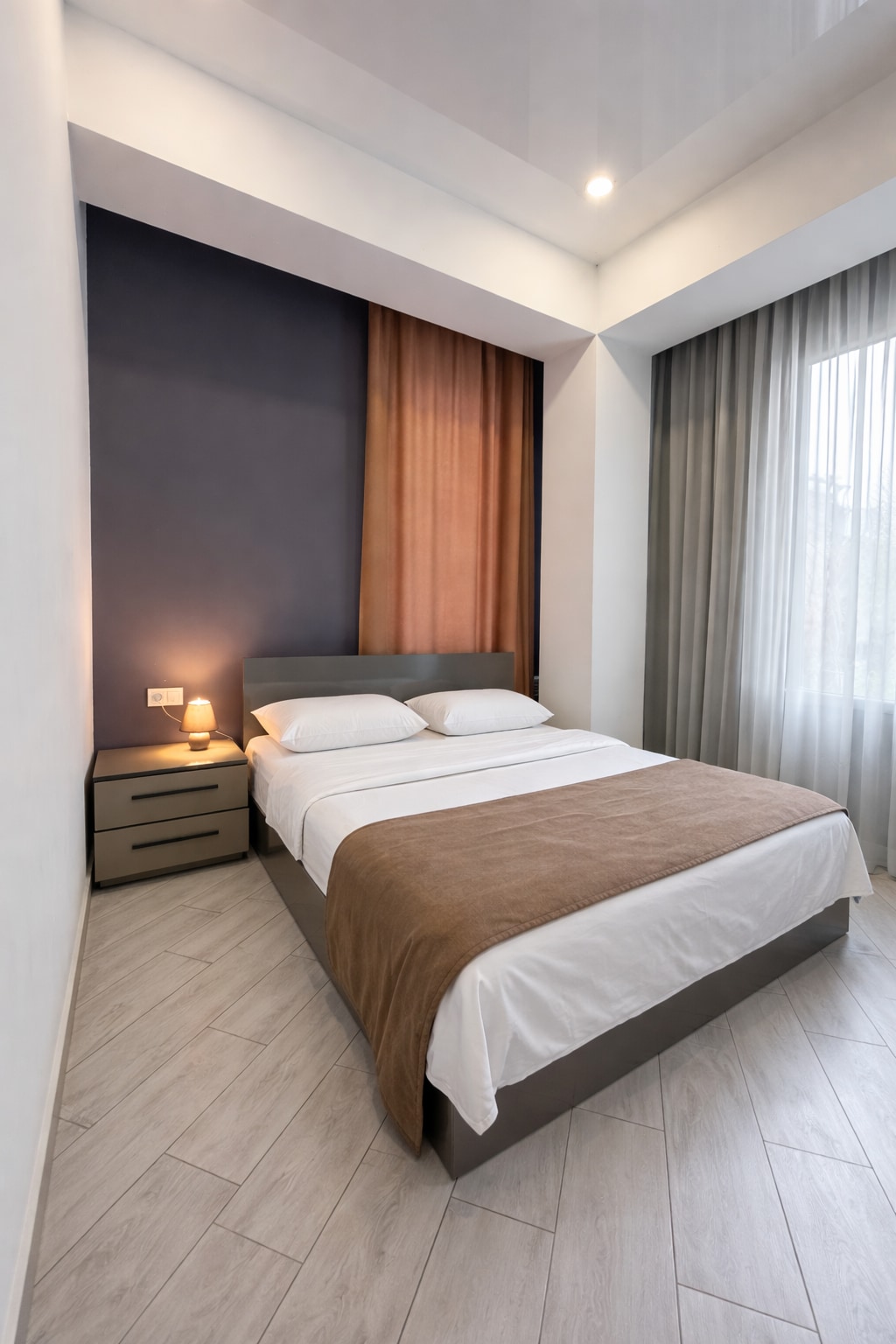 Очень чистая и светлая комната в отеле. Все комнаты оснащены системой климат контроля. Комнаты со стильным дизайном очень уютные и комфортные, оснащенные всем необходимым. Данная комната предназначена для двоих. Возможны варианты отдельных и одной большой (семейной) кровати. Отель в спокойном районе не далеко от шумного центра.
