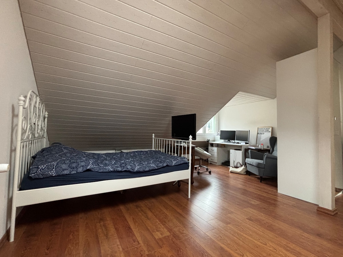 Geräumiges Zimmer im Dachgeschoss mit integriertem Arbeitsplatz. Lauschiger Garten mit diversen lauschigen Sitzplätzen. Familienanschluss mit Katzen und Hunden.