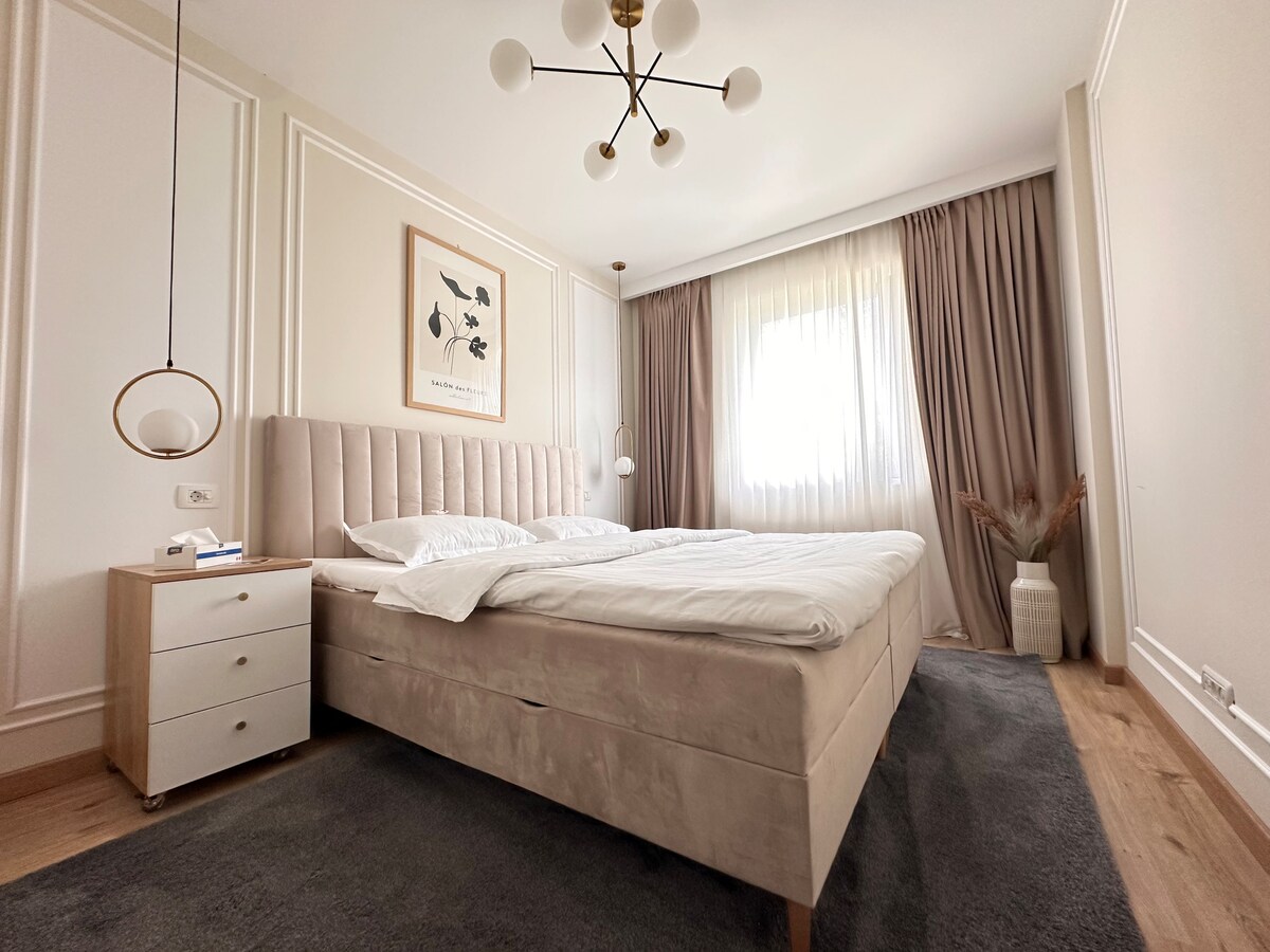 Насладитесь стильным отдыхом в центре Отопени в новейшем жилом районе. Все новые здания, частный парк, ваш частный открытый сад и многие другие. Это современная студия, созданная дизайнером с уникальными предметами мебели, которая выделяется из всех других объявлений. Это идеальный выбор, если вы хотите посетить: Therme Spa, олимпийский бассейн, аэропорт и т. д., также очень близко к автобусной остановке, которая идет прямо в центре Бухареста в «Старый город».