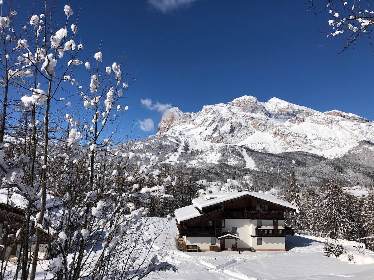 Уютная и романтическая квартира площадью около 150 квадратных метров с 3 спальнями с двуспальной кроватью и 4 ванными комнатами идеально подходит для семейного отдыха, для пар друзей и для всех, кто хочет жить аутентично в Доломитовых Альпах. Около 15-20 минут ходьбы от центра Кортины, всего в 5 минутах от склонов Сокропес, горнолыжного курорта Тофейн и множества летних развлечений. Она тщательно спроектирована и идеально подходит для тех, кто любит красивые, качественные вещи.